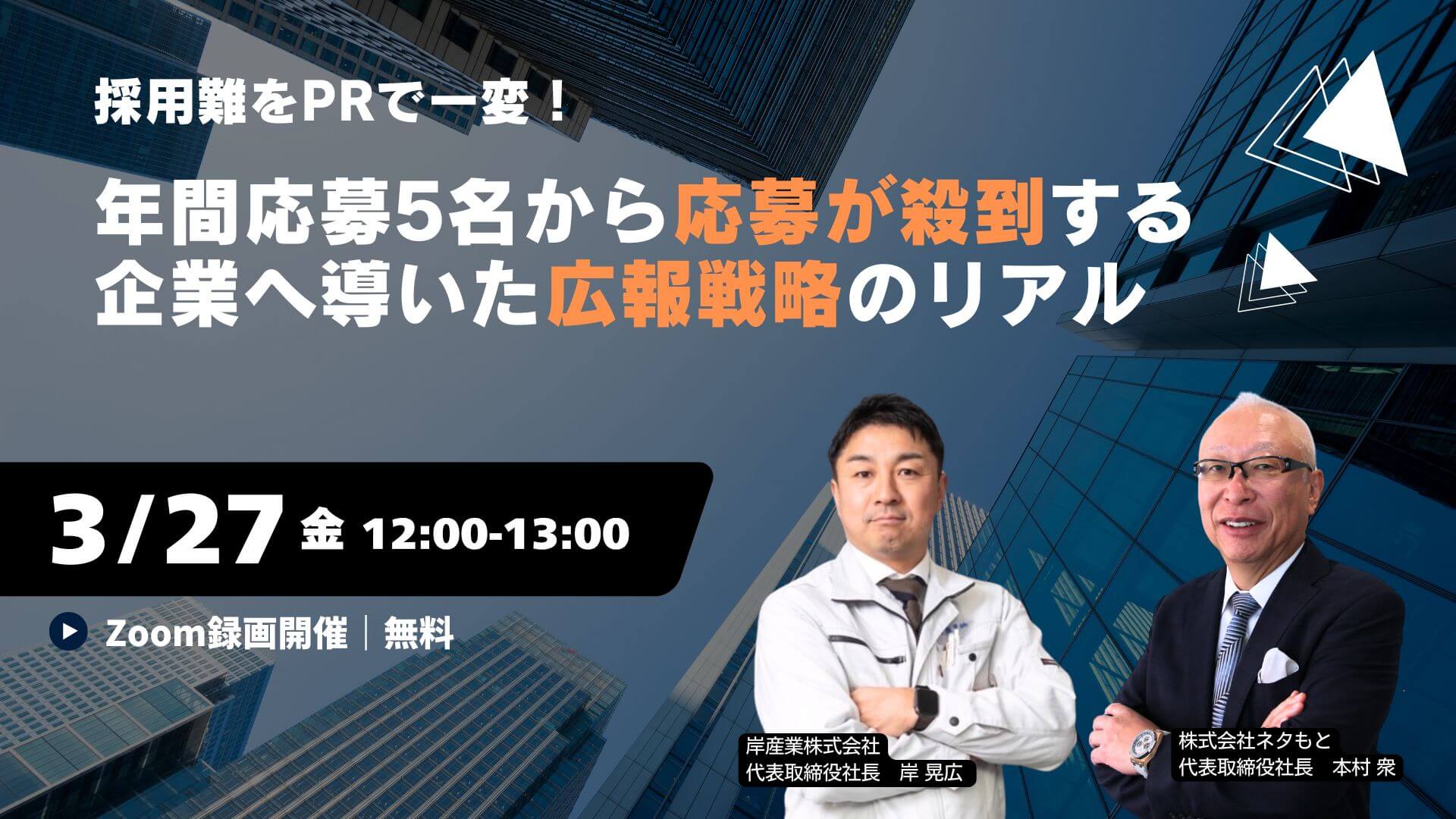 広報PRの力で採用課題を乗り越えた岸産業株式会社 代表取締役社長 岸晃広 氏をゲストに迎え、新規事業との掛け合わせや社長主導の体制構築、情報発信によるメディア露出を通じて、採用成果や企業信用力の向上を実現したプロセスを解説いただきます。